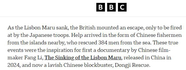 文章最后说,电影《东极岛》将于8月22日在英国和美国上映;纪录片《里斯本丸沉没》目前正在英国通过奥德赛中文电影频道网站播放,以纪念中国人民抗日战争暨世界反法西斯战争胜利80周年。